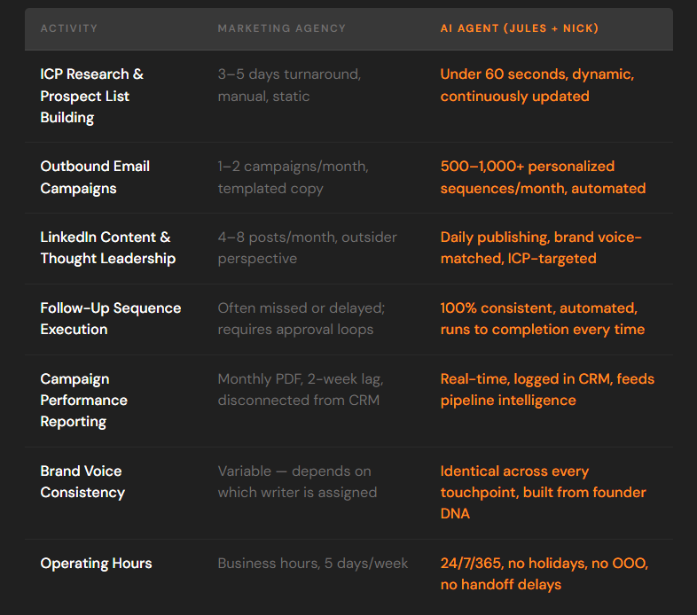 From the AI Field: Side-by-side comparison what a retained marketing agency delivers vs. what an AI marketing employee delivers across 7 core activities. Once you see it laid out, it's hard to unsee.