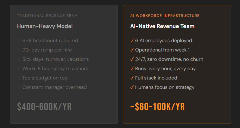 What to do next: If any one of these questions made you pause, you're ready for the conversation. If all three made you pause, you're likely already behind and need to move quickly. Run a 30-minute AI Workforce Audit with us, we map your current revenue team against the AI workforce model and show you where the leverage is, what the ROI looks like for your specific business, and what a phased transition looks like in practice. No pitch. No slides. Just the math on your team.