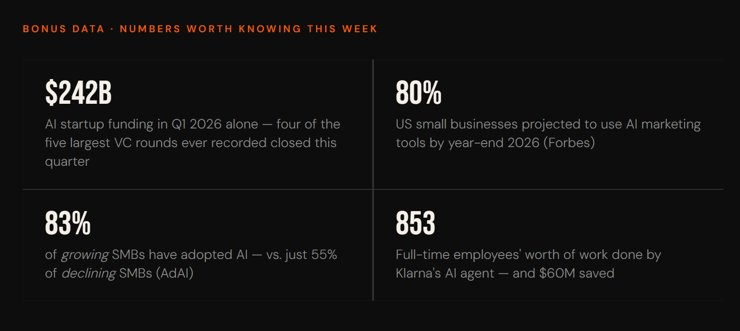 "93% of small businesses say AI is working for them. Only 14% have actually rebuilt how they operate around it. That 79-point gap is where every competitive advantage in 2026 is hiding. The companies that close it this quarter won't just grow they'll buy the ones that didn't."