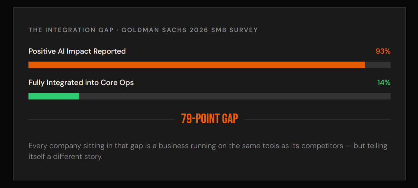 Goldman Sachs' 2026 small business survey: 93% of SMBs report positive AI impact. Only 14% have fully integrated it into core operations. Fortune/Gallup sees the same split. That 79-point gap isn't a technology problem it's an execution problem. Companies in the gap tried AI for a task or two and called it a strategy. They're not AI companies. They're traditional companies with AI subscriptions.