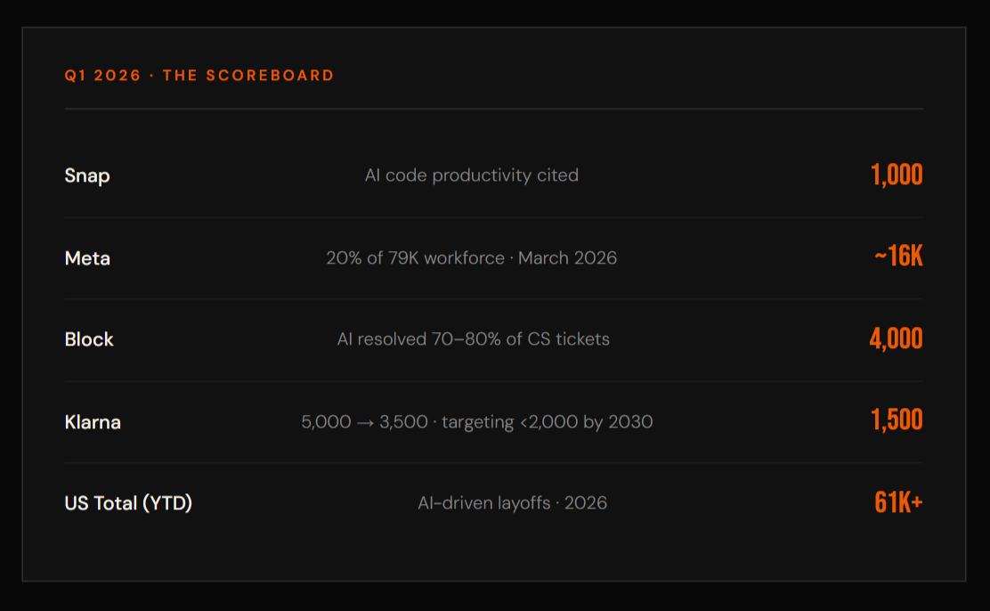 On April 15, Snap eliminated 16% of its workforce, 1,000 people, and withdrew 300+ open roles. Stated reason: AI-generated code productivity. Not restructuring. Not macro. AI. Challenger, Gray & Christmas now reports AI is the #1 cited reason for US layoffs in March 2026, with tech cutting 52,050 jobs in Q1 alone up 40% year-over-year.
