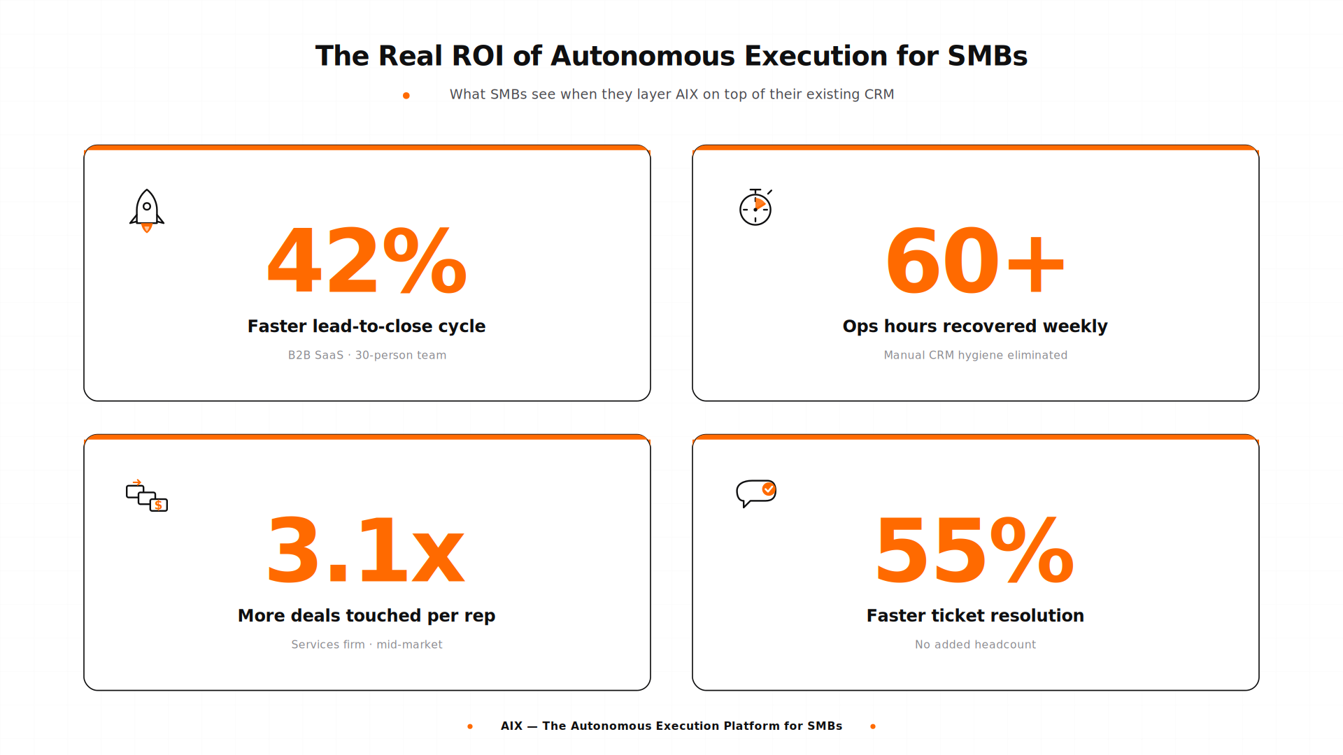 Case Snippet — B2B SaaS (30-person team): After deploying AIX agents for inbound qualification and outreach, the company reported a 42% faster lead-to-close cycle and recovered roughly 60+ ops hours per week previously lost to manual CRM hygiene and follow-up coordination.