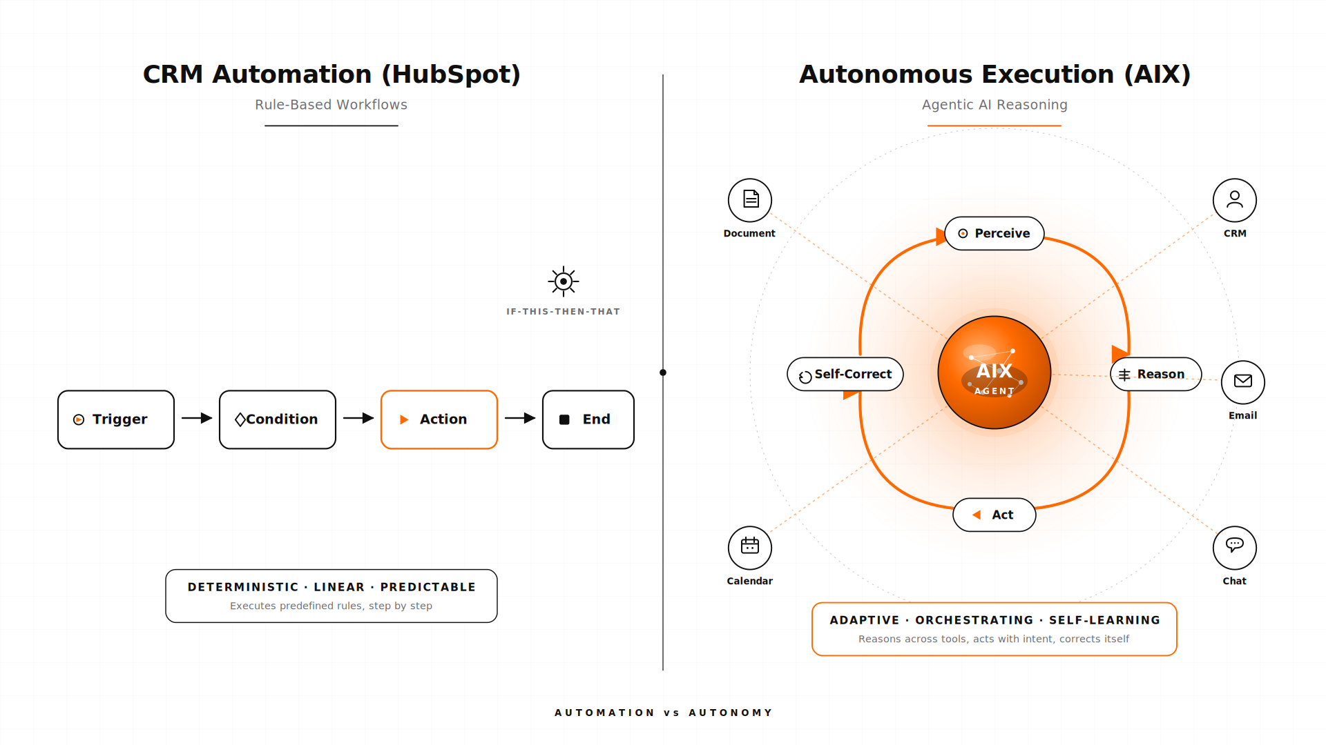 CRM automation, as exemplified by HubSpot, is built on if-this-then-that logic. When a lead fills out a form, an email is sent. When a deal moves to a new stage, a task is created. These workflows are powerful, but they are fundamentally deterministic. They require humans to design every step, anticipate every scenario, and manually intervene whenever edge cases appear.
